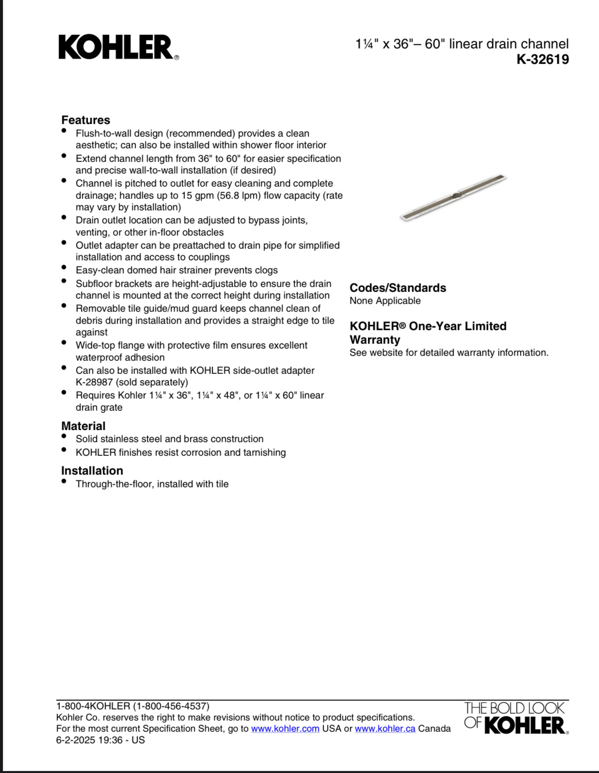 - Requires Kohler 1¼” x 36″, 1¼” x 48″, or 1¼” x 60″ linear drain grate