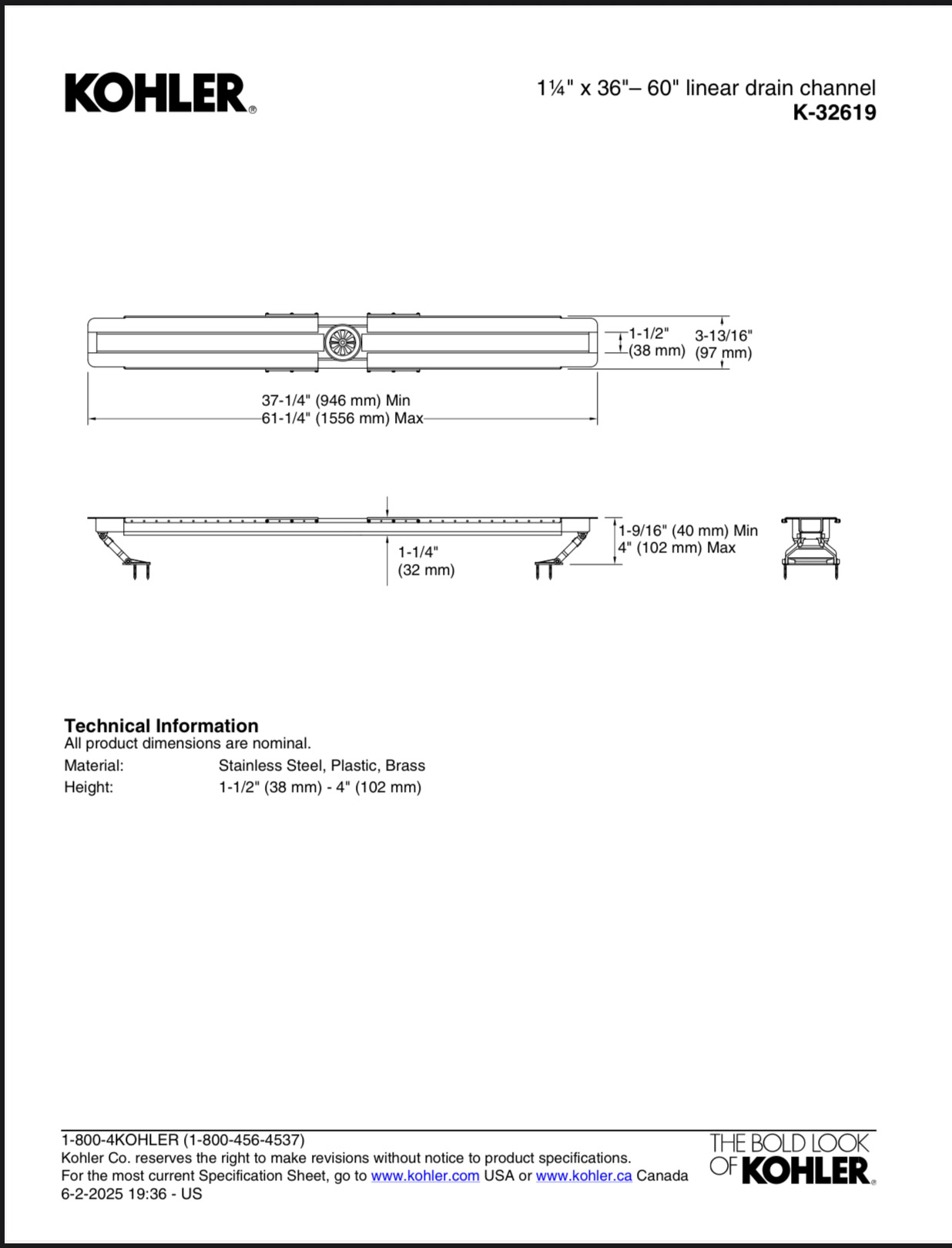 KOHLER 1-1/4″ x 36″-60″ linear drain channel