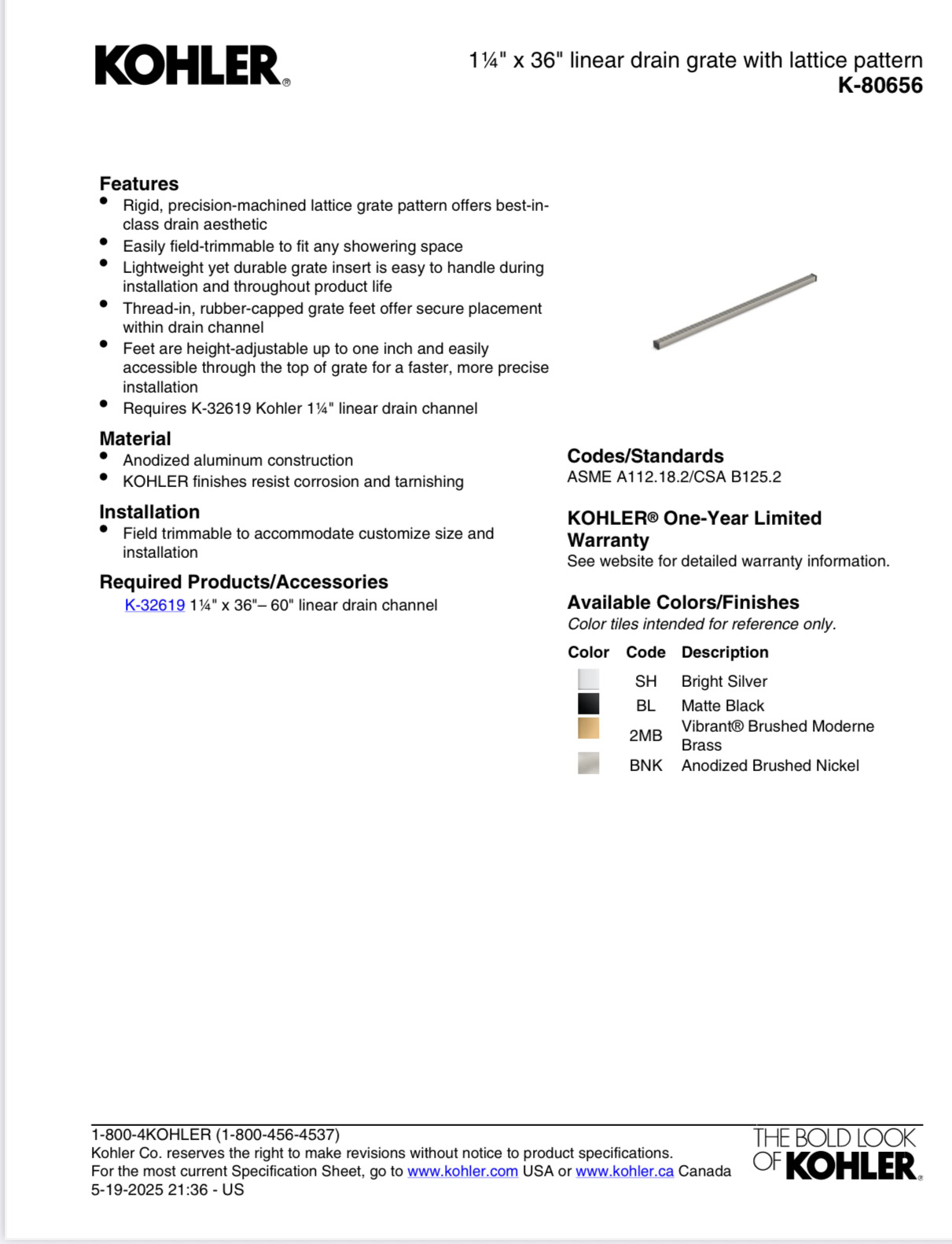- Requires K-32619 Kohler 1¼” linear drain channel
