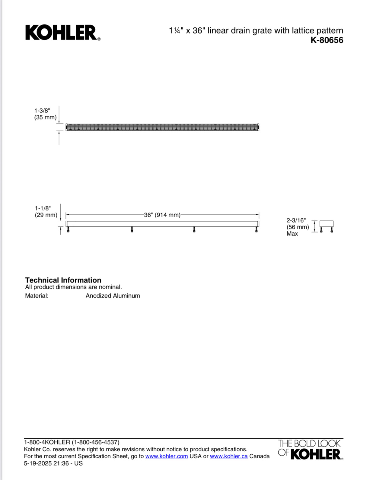KOHLER 1-1/4″ x 36″ linear drain grate with lattice pattern