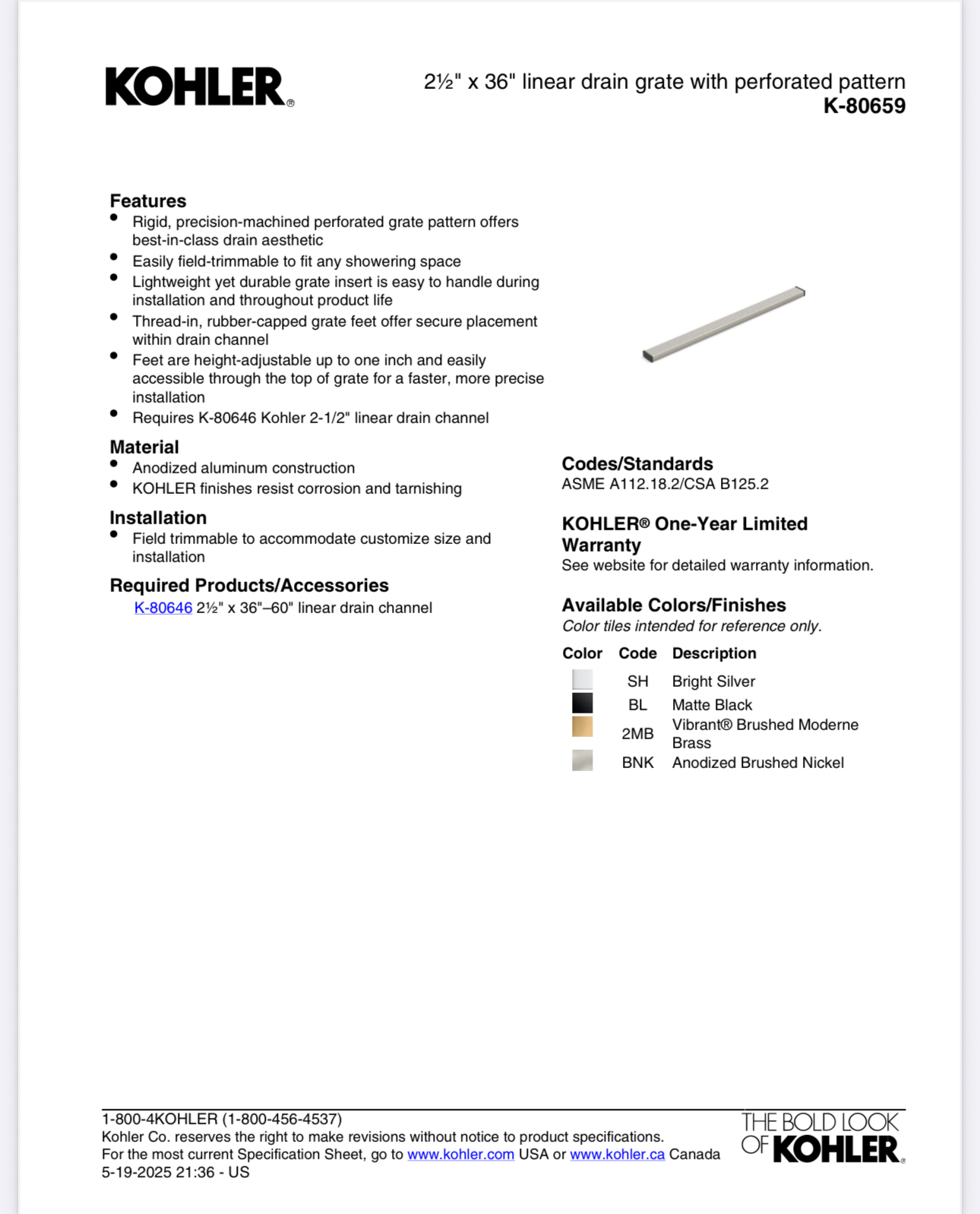 - Requires K-80646 Kohler 2-1/2″ linear drain channel