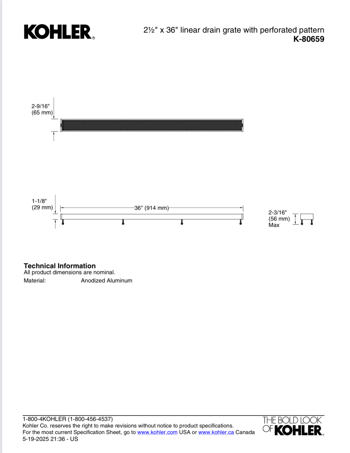 KOHLER 2-1/2″ x 36″ linear drain grate with perforated pattern