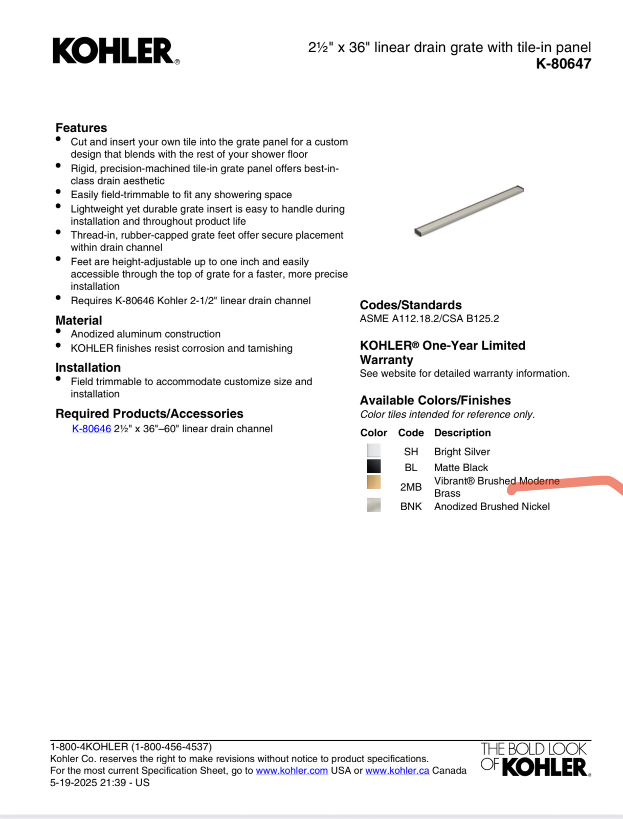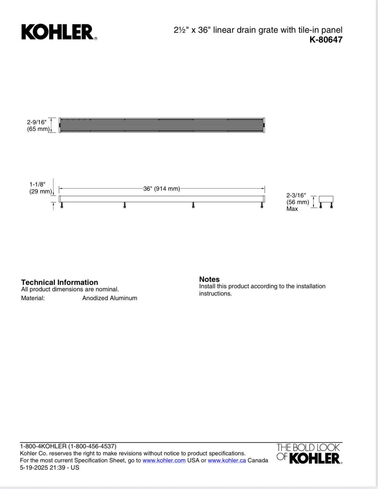 - Requires K-80646 Kohler 2-1/2″ linear drain channel