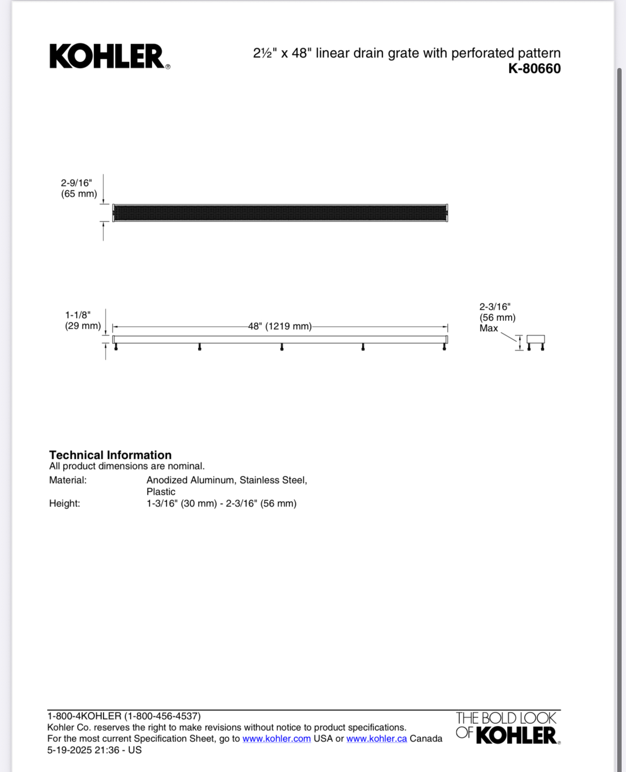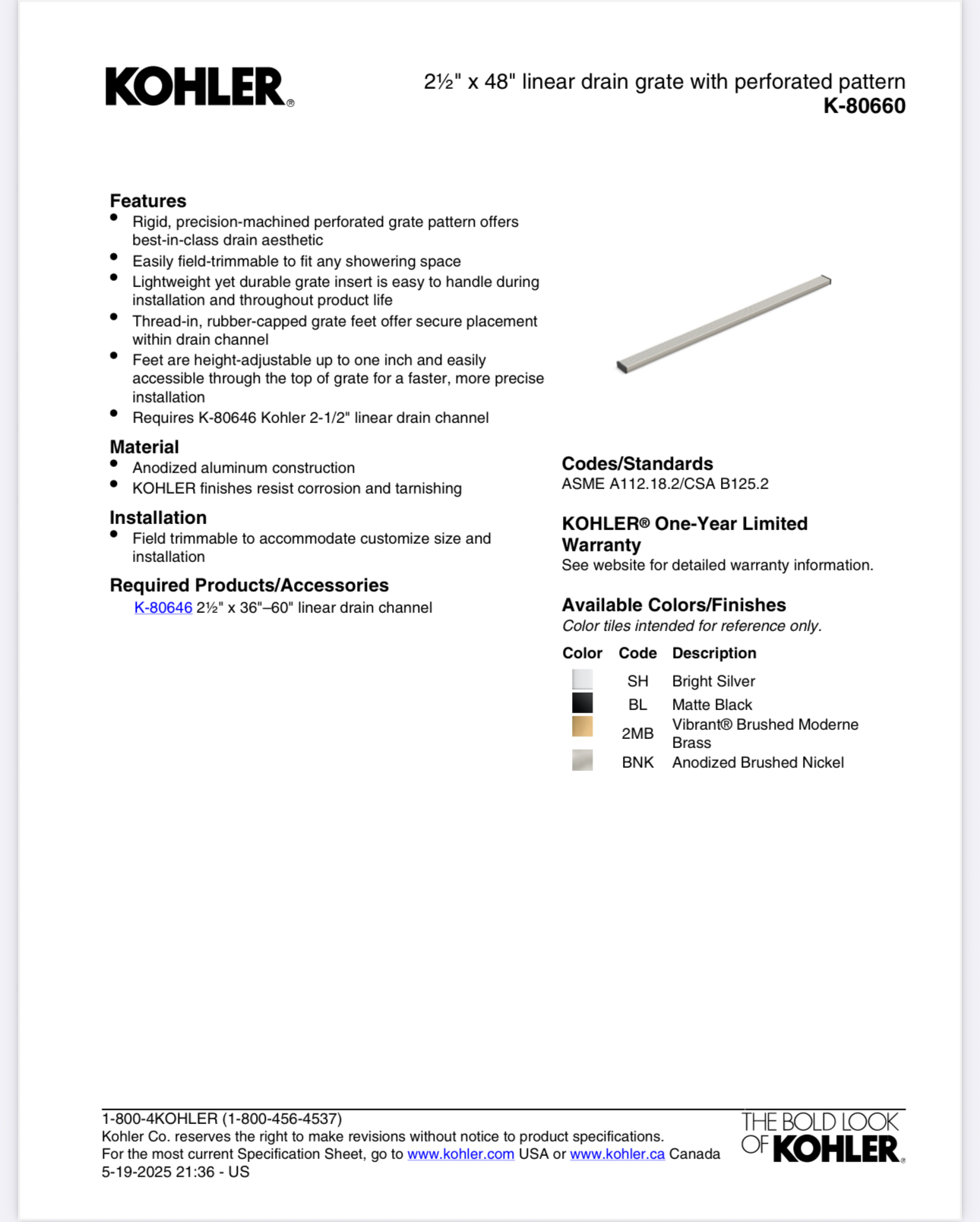 - Requires K-80646 Kohler 2-1/2″ linear drain channel