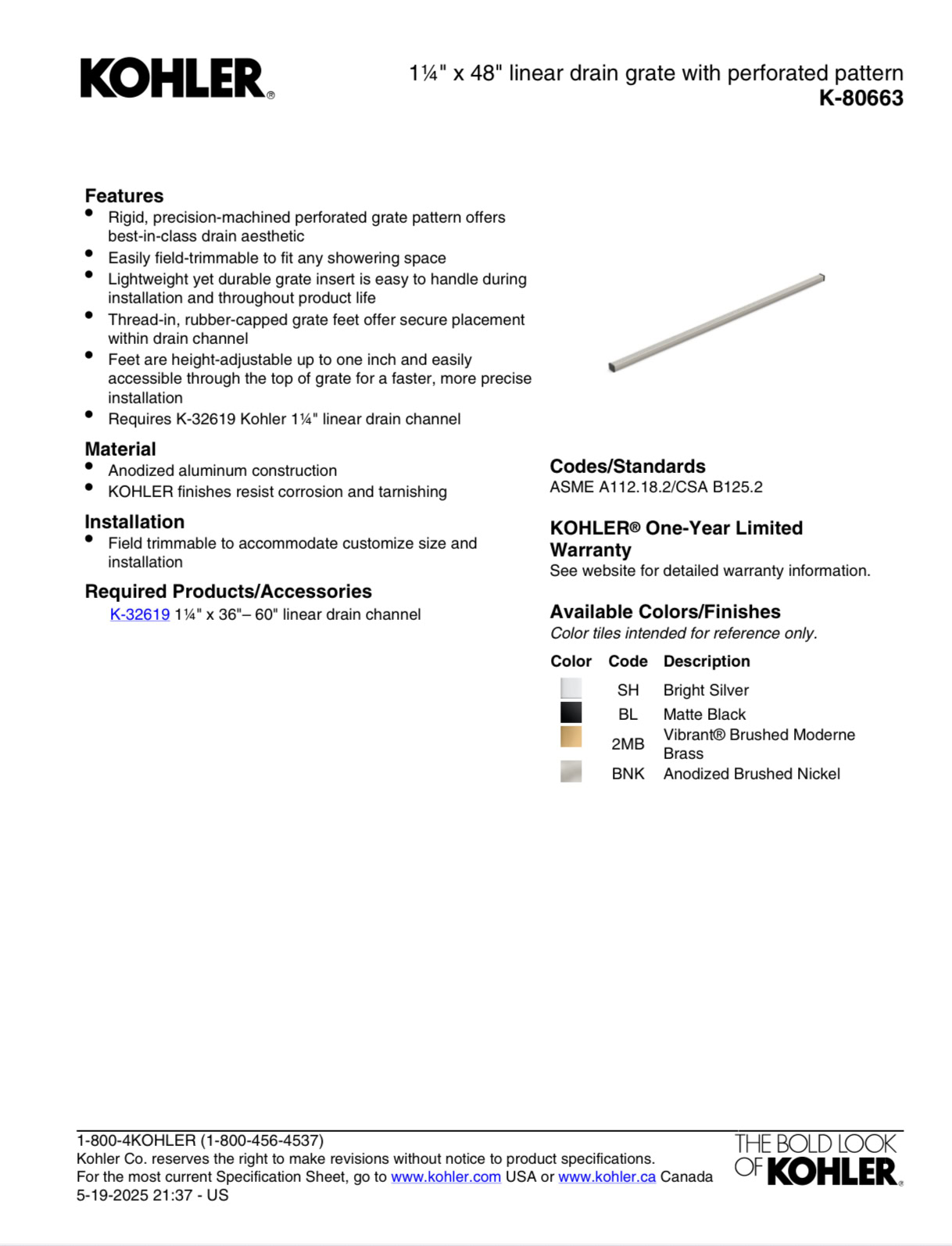 - Requires K-32619 Kohler 1¼” linear drain channel