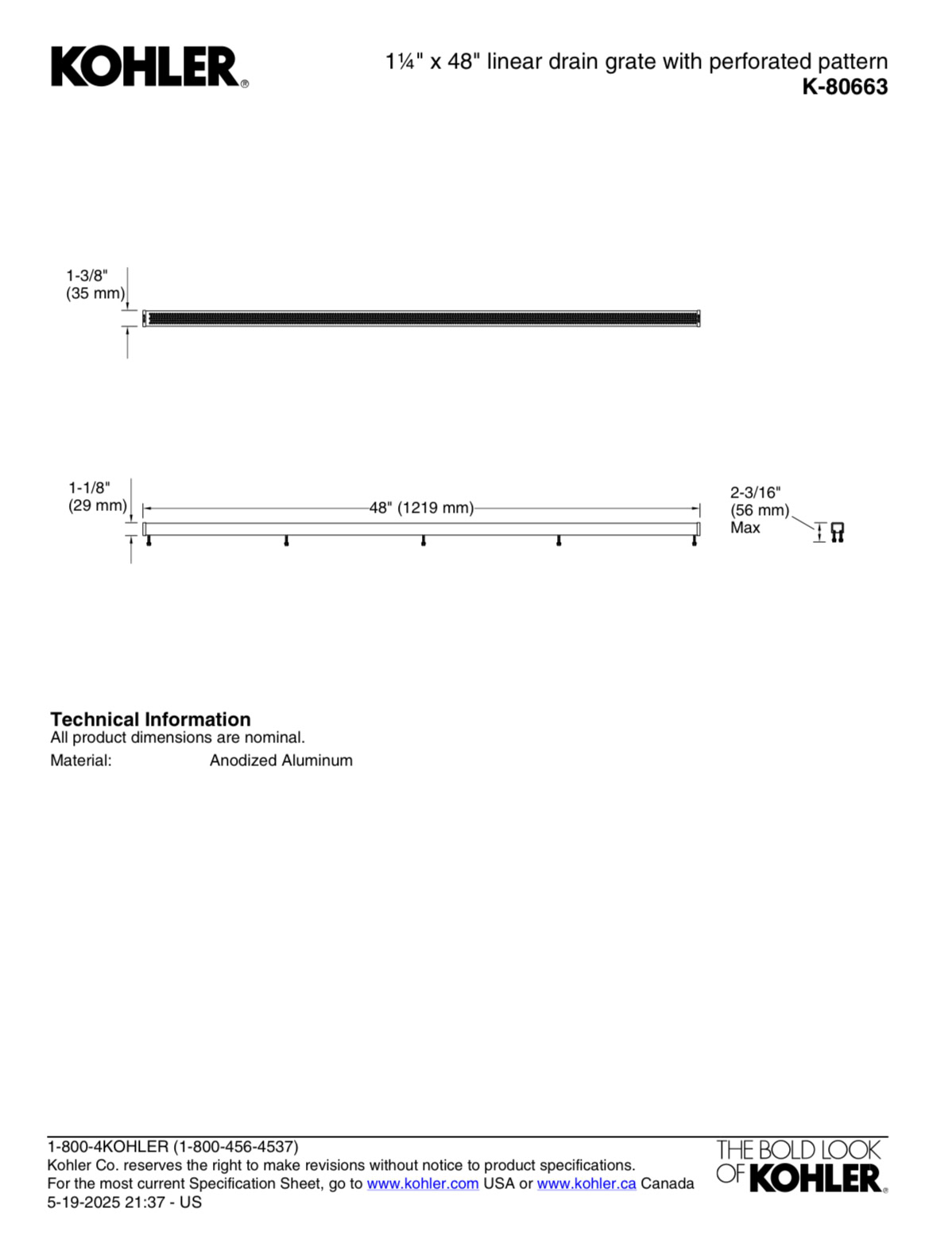 KOHLER 1-1/4″ x 60″ linear drain grate with perforated pattern