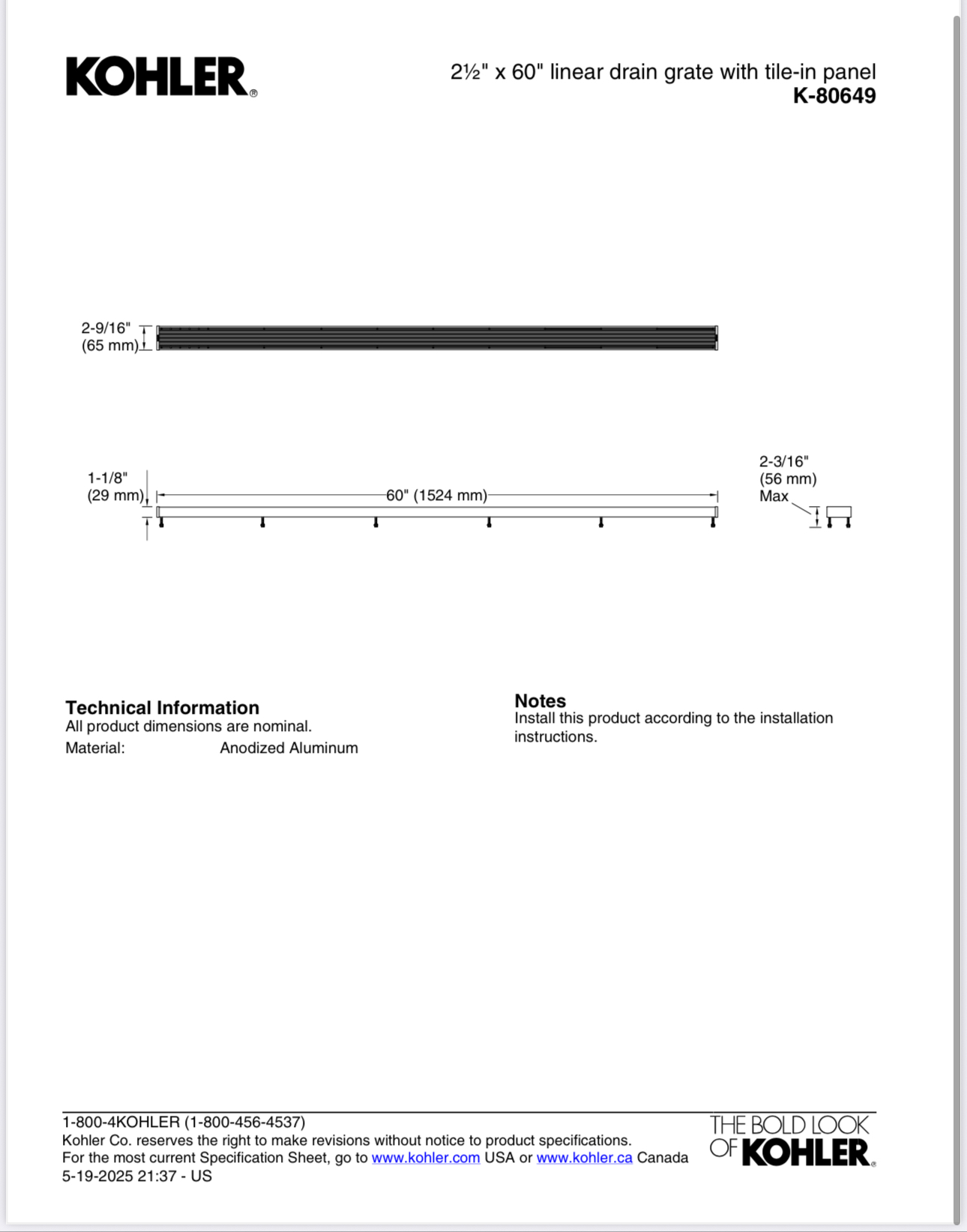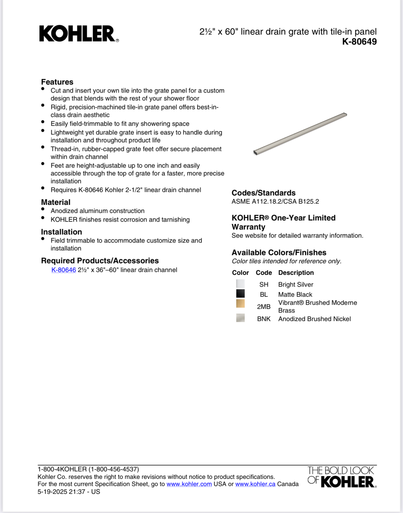 - Requires K-80646 Kohler 2-1/2″ linear drain channe