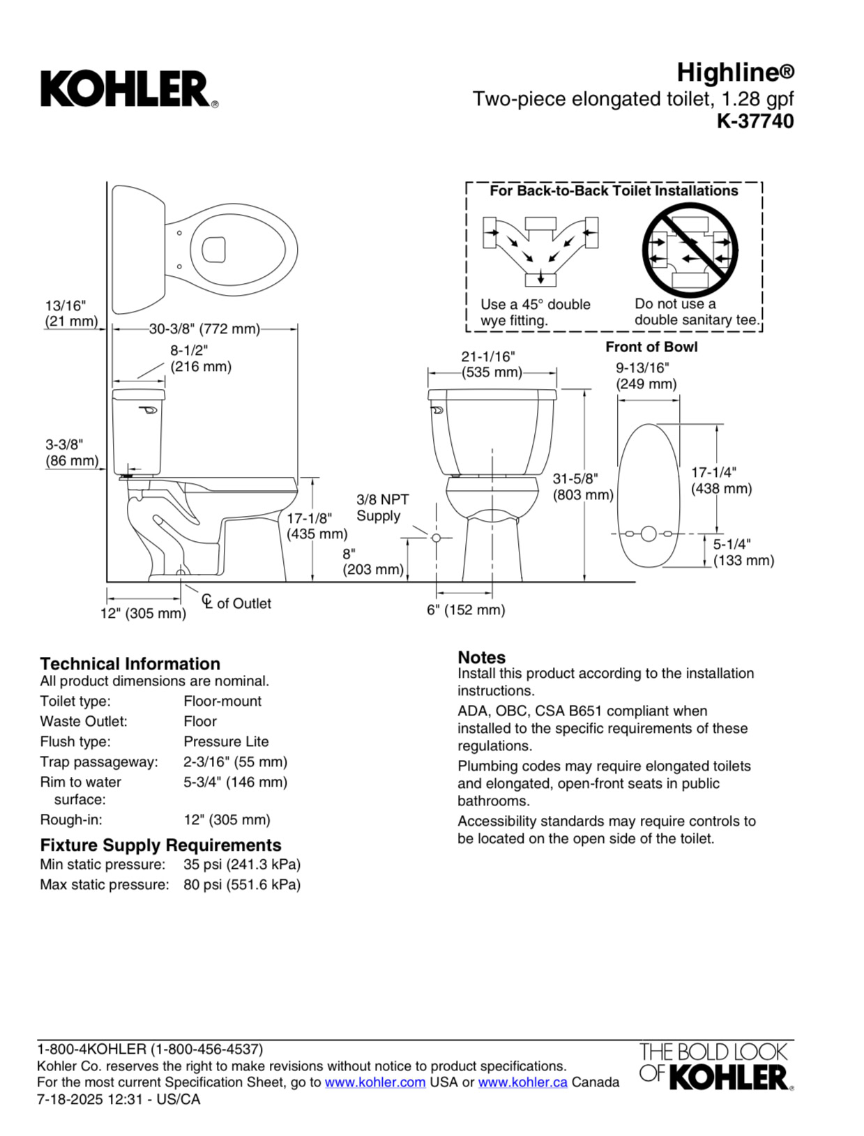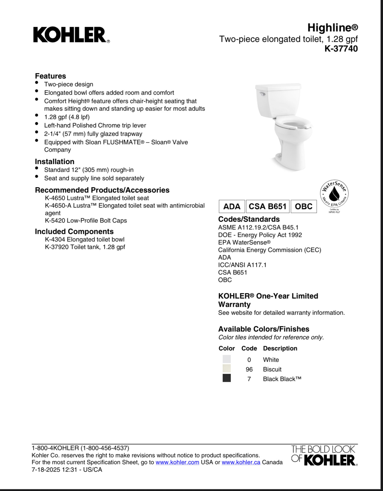 Enjoy clean, simple design and efficient performance with this KOHLER Highline two-piece elongated toilet, which combines both style and function. Featuring Pressure Lite technology, which raises the bar for exceptional bulk flushing performance. This contemporary style Pressure Lite toilet features chair-height seating and an elongated design for added room and comfort.